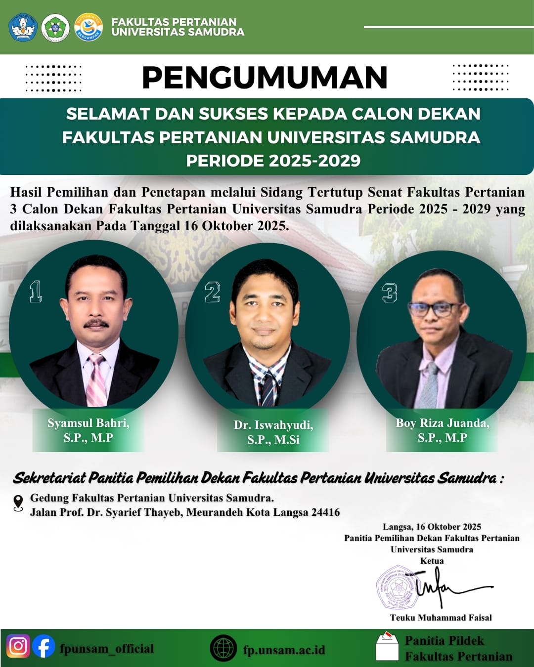Hasil Pemilihan dan Penetapan melalui Sidang Tertutup Senat Fakultas Pertanian 3 Calon Dekan Fakultas Pertanian Universitas Samudra Periode 2025 – 2029 yang dilaksanakanĀ Pada Tanggal 16 Oktober 2025 di Ruang Rapat Fakultas Pertanian UniversitasĀ Samudra