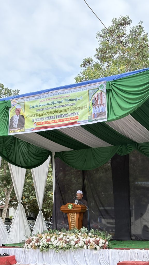 Keluarga Besar Fakultas Pertanian Universitas Samudra telah sukses menyelenggarakan Peringatan Maulid Nabi Muhammad SAW 1447 H pada 30 Oktober 2025. Acara ini bertujuan untuk meneladani akhlak mulia Rasulullah SAW dan mempererat ukhuwah Islamiyah. Dihadiri oleh pimpinan, dosen, staf, dan mahasiswa, dan tamu undangan serta turut hadir juga Pimpinan dan Santri dari Pondok Pesantren Dayah Bustanul Hidayah Matang Kuli Aceh Utara.